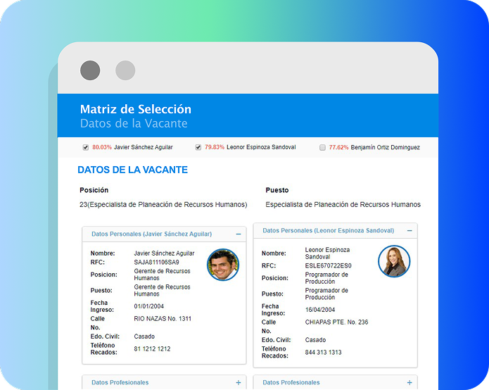 Identifica talento clave, evalúa desempeño y potencial, y fortalece la planeación de sucesión dentro de la organización. Todo desde una herramienta visual que optimiza la evaluación de desempeño, el desarrollo organizacional y la toma de decisiones estratégicas en talento.