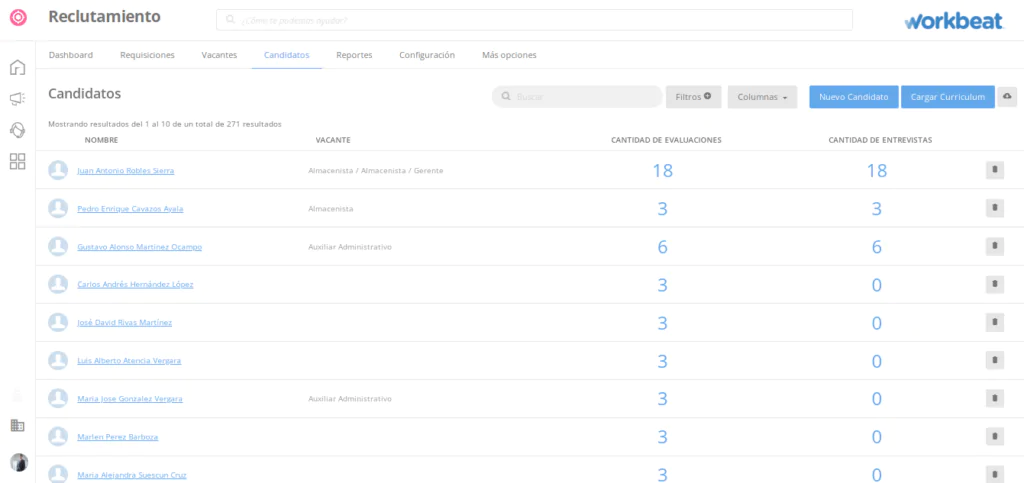 Una vez realizado el filtrado de candidatos, ha llegado el momento de gestionarlos. Agruparlos dentro de una plataforma te permitirá ver la lista de talentos que han iniciado o iniciarán un proceso de selección dentro de tu compañía, así como agrupar sus datos más importantes como nombres, información de contacto, currículums y cuántas evaluaciones o entrevistas han realizado o llevarán a cabo durante el proceso.