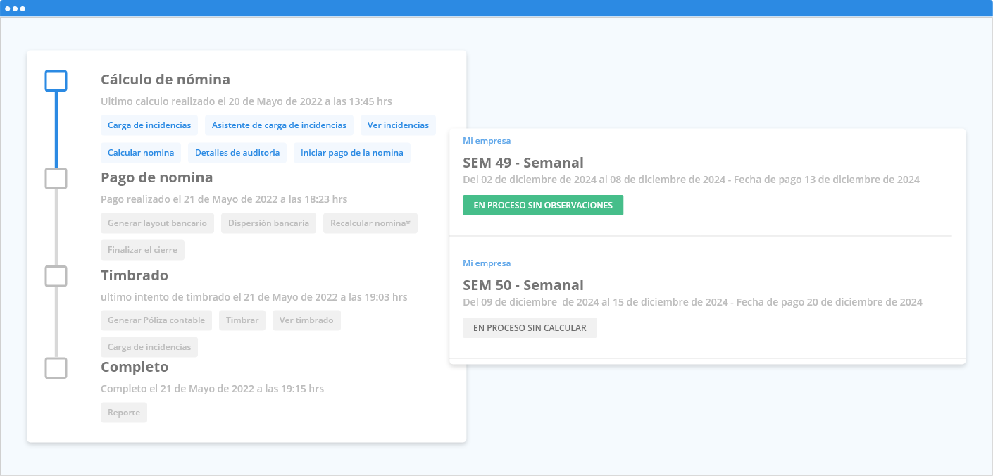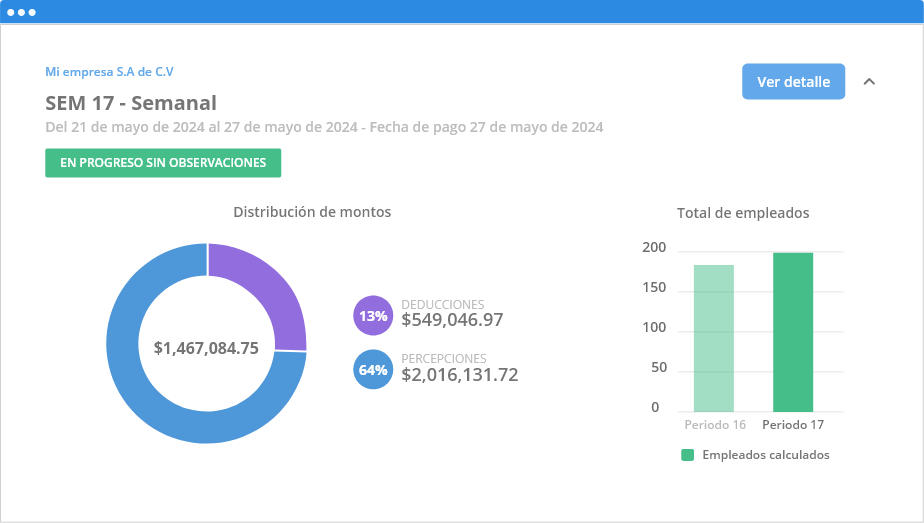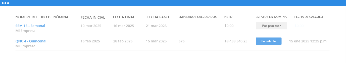 Mantén siempre el control total de tus procesos de nómina: conoce su estatus, identifica si ya fueron timbrados o están pendientes de procesar, y visualiza fácilmente a qué razón social pertenecen.