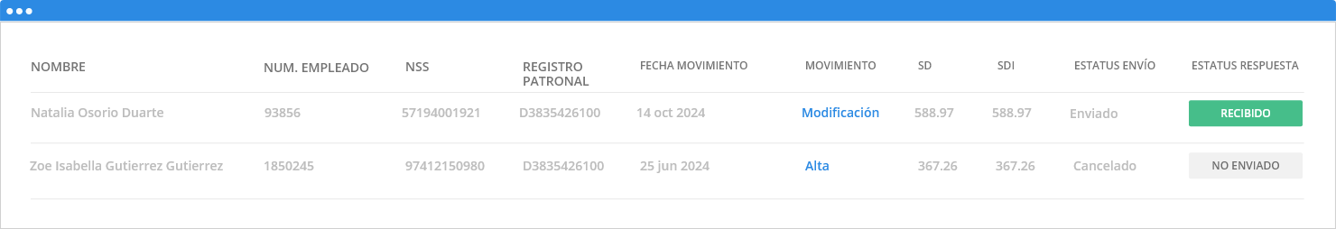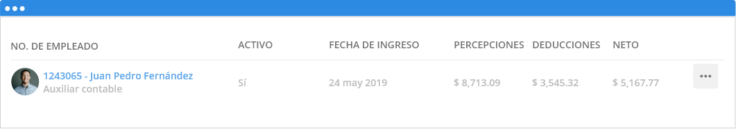 Con el listado de empleados, consulta información clave como percepciones, fecha de ingreso o estatus de baja, y accede al detalle individual de cada colaborador con solo un clic.
