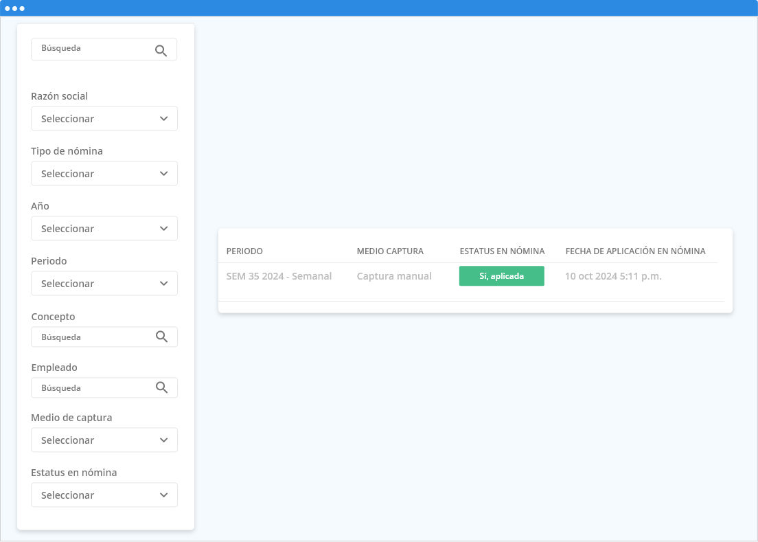 ¿Necesitas un panorama general? Aplica filtros personalizados para ver la información por tipo de nómina, año, periodo o empleado. Además, consulta el detalle de cada incidencia, el medio de captura y su estatus en la nómina: pendiente, aplicada o no aplicada. ¿Requieres un respaldo? Podrás descargar la información cuando lo necesites