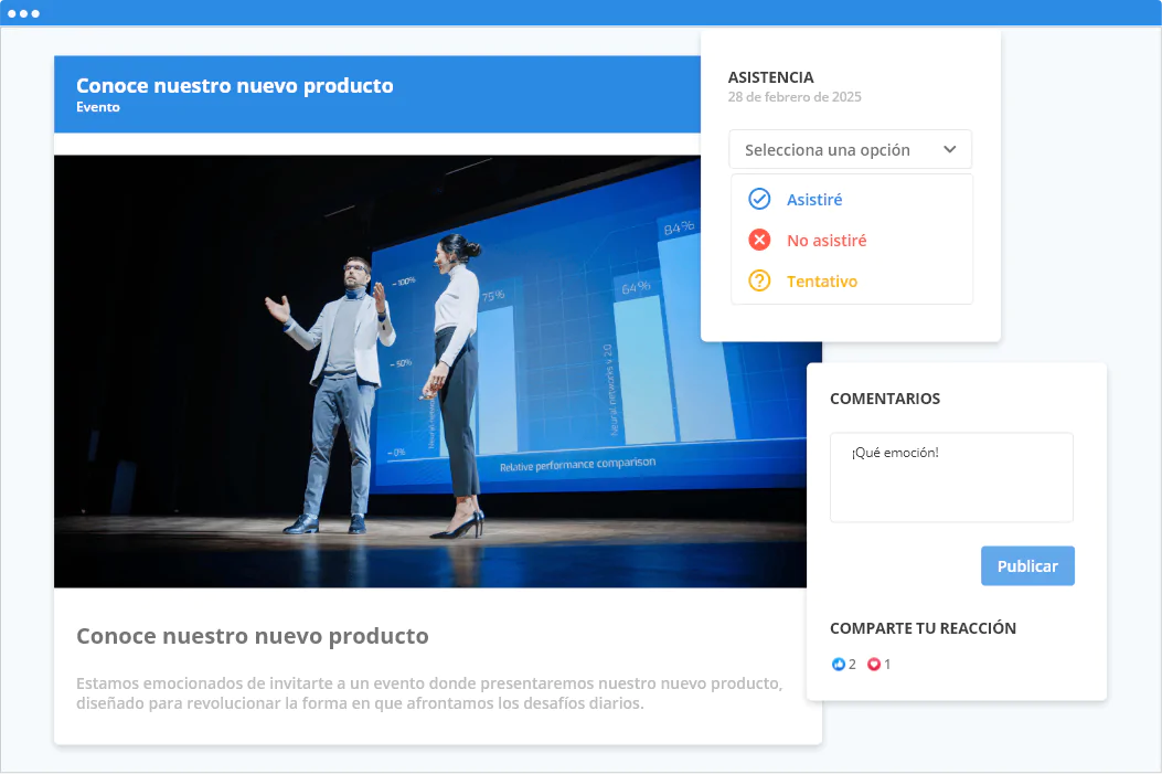 Con las mejoras en comunicación, ahora tus empleados podrán compartir su reacción a tus publicaciones, además de confirmar su asistencia a tus invitaciones.