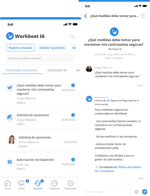Imagina esto: un nuevo colaborador tiene una duda un domingo sobre el código de vestimenta para su primer día. En lugar de esperar, simplemente entra a la SuperApp y consulta con Workbeat IA. Con esta tecnología tus colaboradores reciben atención inmediata en cualquier momento del día, mientras tú recuperas tiempo valioso para dedicarlo a lo que más importa: las personas, la estrategia y el desarrollo del talento.